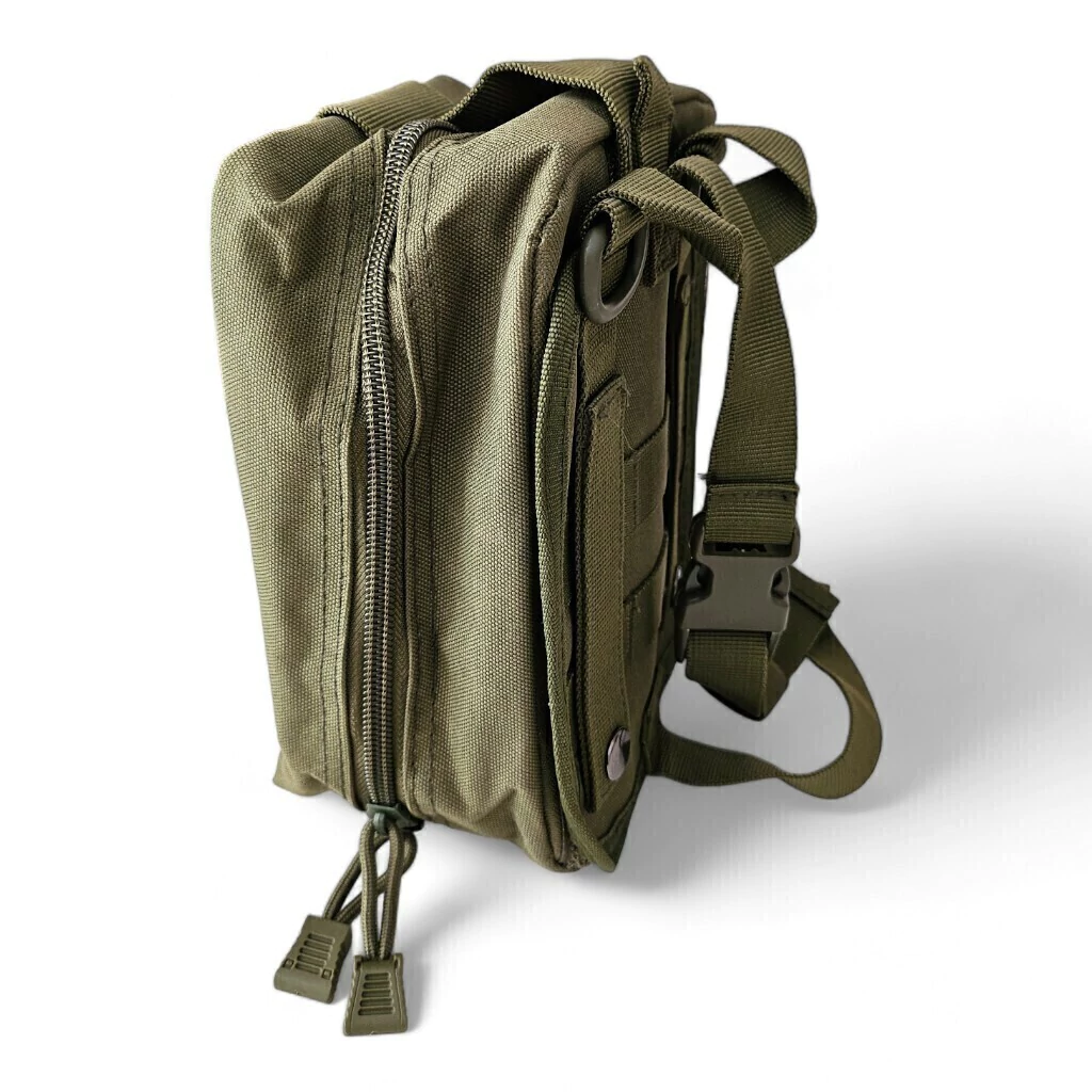 Bolso para primeros auxilios con varios bolsillos, sistema molle para anclaje y llevar más cosas en el exterior. Cómodo y regulable.