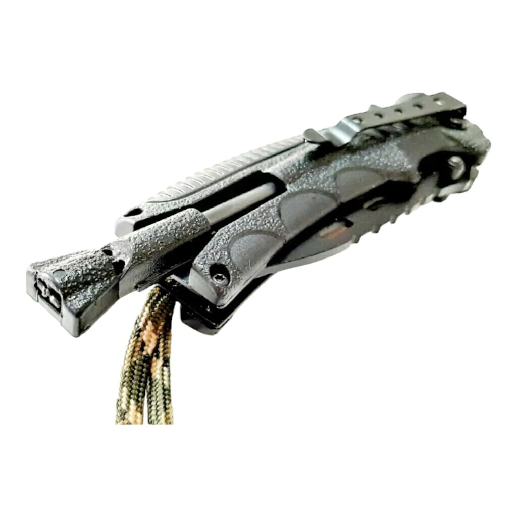 Dispone Pedernal, fuerte cuerda paracord y doble Barril que facilita la apertura ambidiestra + su magnífico Clip que asegura su traslado. Hoja de 9 cm.