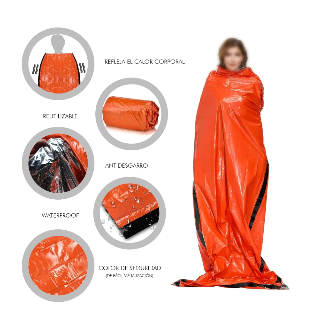 Bolsa isotermica mantiene el calor del cuerpo en situaciones de emergencia. Es reutilizable.