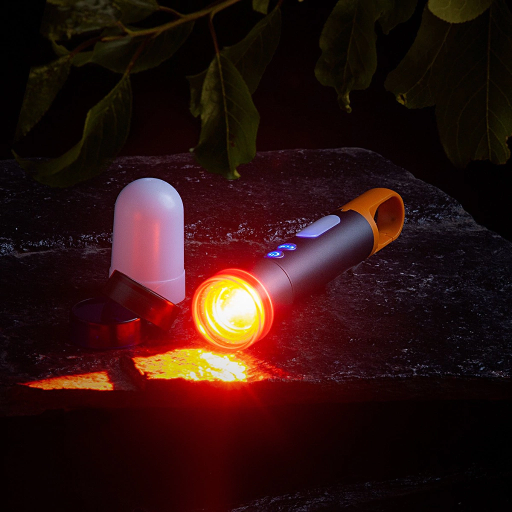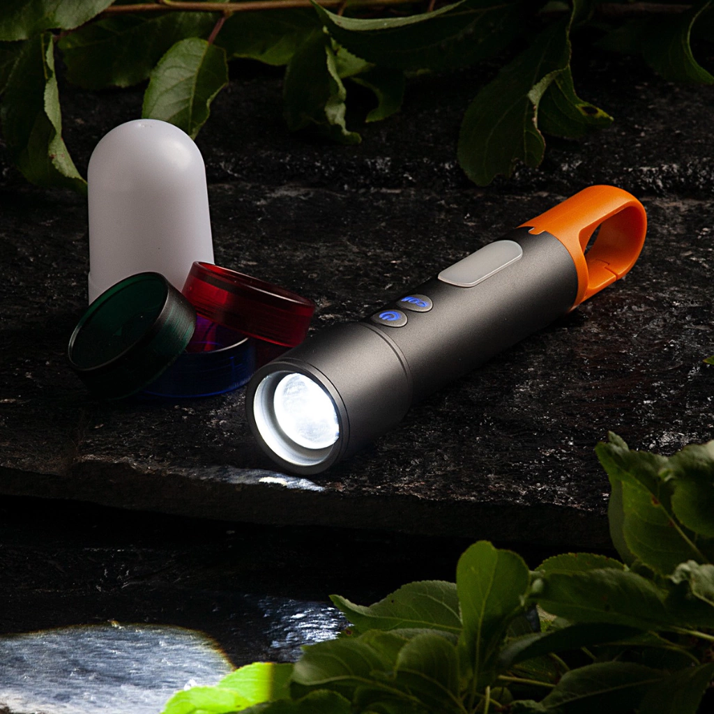 Incluye un accesorio (modo farol) y 3 filtros de color intercambiables. El haz de luz es regulable gracias a su función de zoom. Es recargable a través de USB y se incluye un cable USB tipo C.