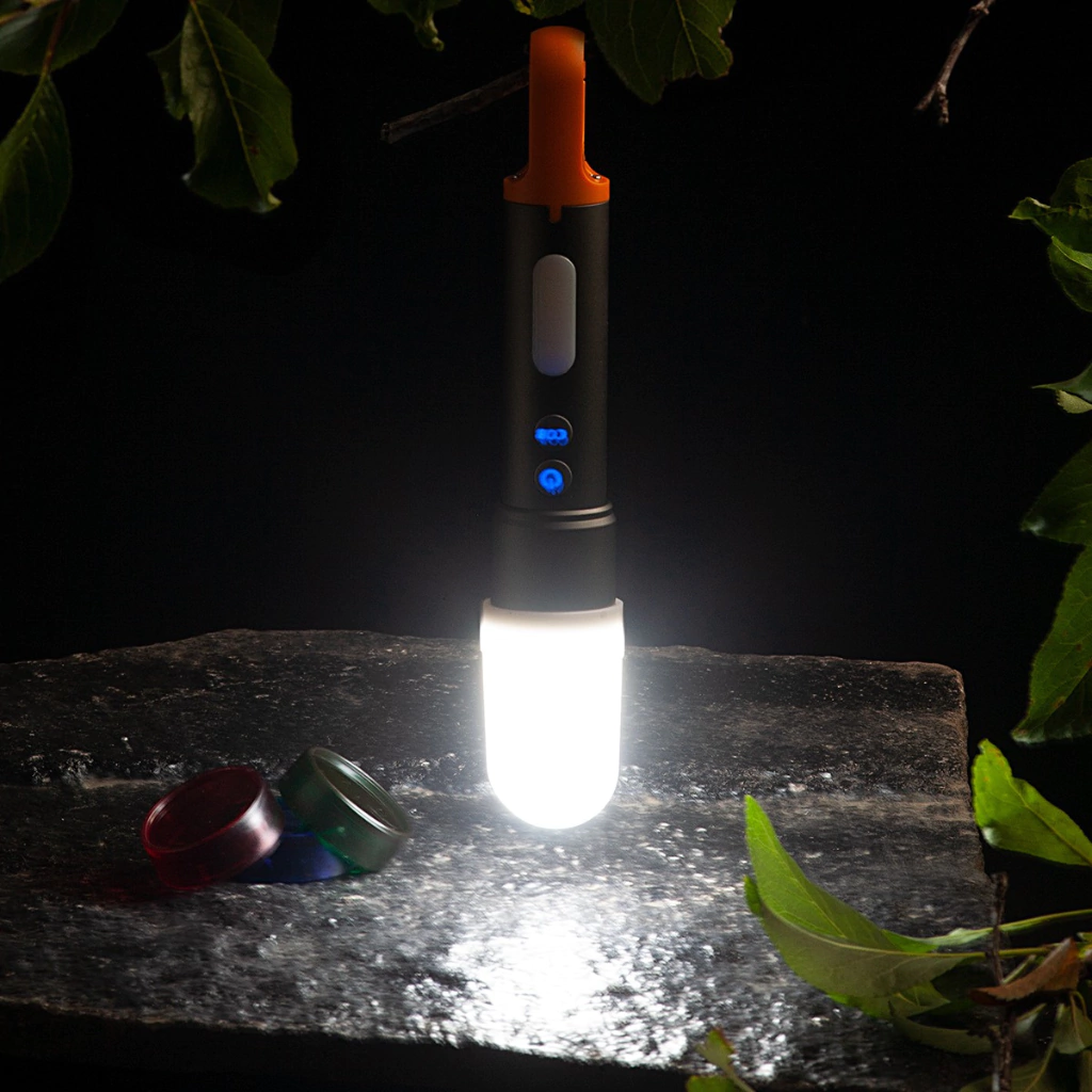El cuerpo está hecho de Aluminio + Reflector PC y tiene un acabado de oxidación anodizada. Su potencia es de 600 lúmenes y es fácil de colgar para utilizar como farol o luz de emergencia.